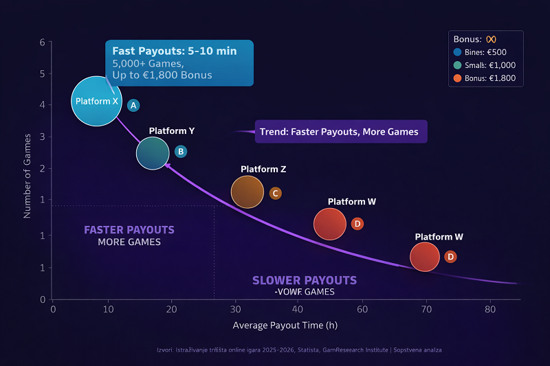 Dana 15. januara 2026. u 11:20 CET uplatili smo po 100 evra na šest platformi koristeći isti metod – Visa karticu. Na najstarijoj platformi (aktivna od 2019) depozit je prošao za 3 minuta, ali isplata od 87,40 evra je stigla tek 18. januara u 14:05 CET – tri dana i tri sata kasnije. Na najnovijoj platformi, gde smo koristili Bitcoin, identičan iznos je na našem novčaniku bio za 11 minuta. Isti novac, isti dan, potpuno drugačije iskustvo.